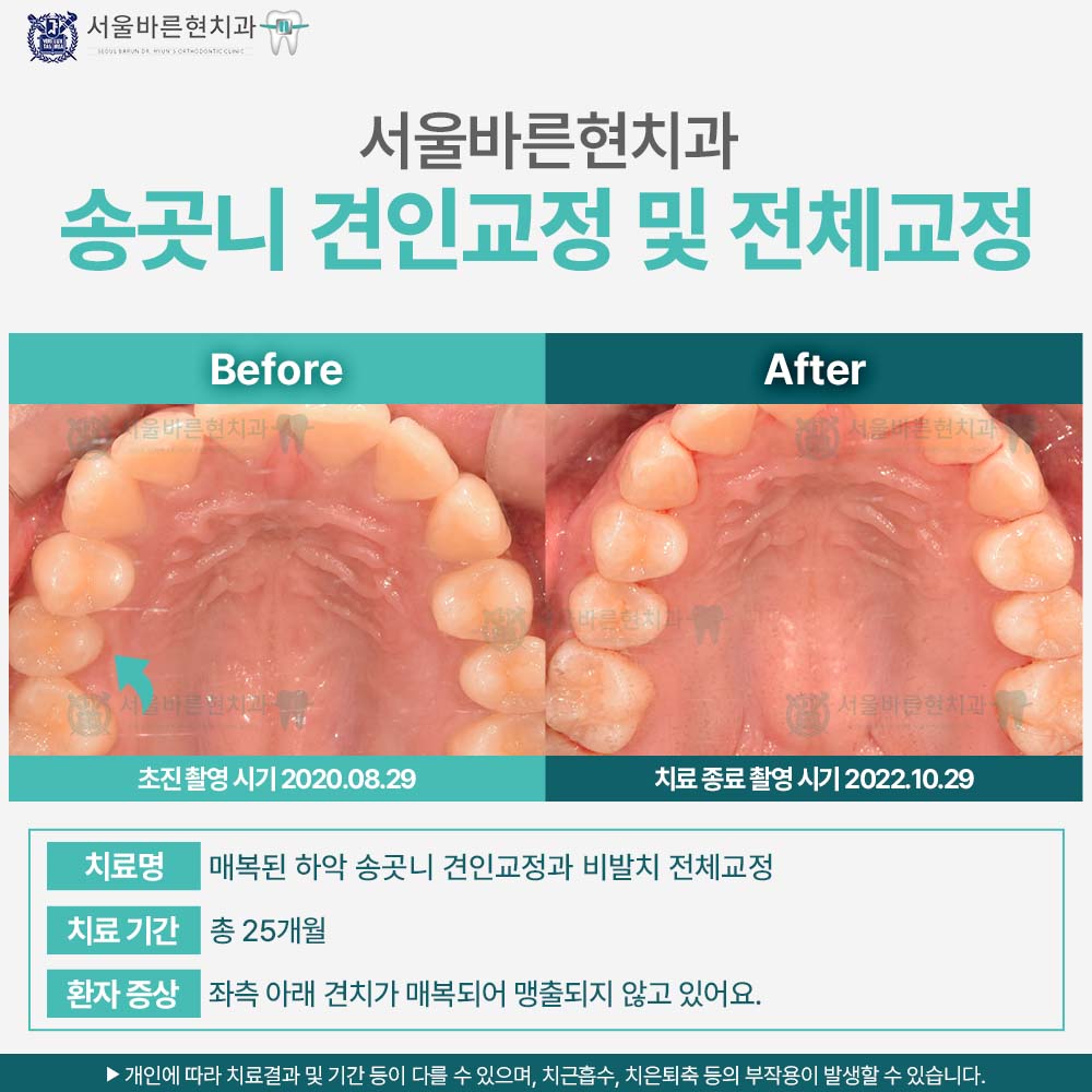 좌측 아래 견치가 매복되어 맹출 되지 않고 있는 만 17세 여학생입니다. 견치가 치조골 내에 매복되어 있었고 맹출 공간 또한 소실되어 견치의 배열 공간을 재확보하고 견인을 시도해야 하는 부정교합 상황이었습니다. 영구치의 매복은 육안으로 인지될 때는 견인시기가 늦은 경우가 많고 성인기에는 견인이 불가할 수 있어, 영구치 교환시기에는 치과에 내원하여 후속 영구치의 정상맹출을 점검하는 정기검진이 중요합니다. 다행히도 매복되어 있던 견치는 교합선상으로 잘 견인되어 배열되었고 환자는 좋은 교합으로 치료를 마무리할 수 있었습니다.