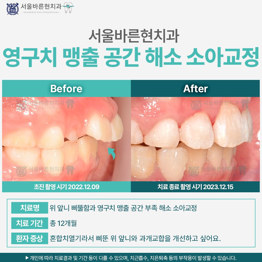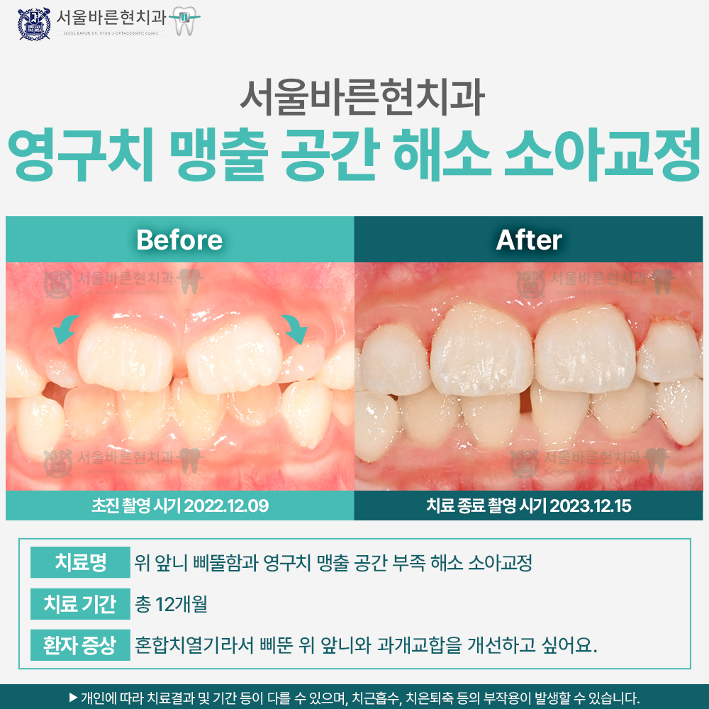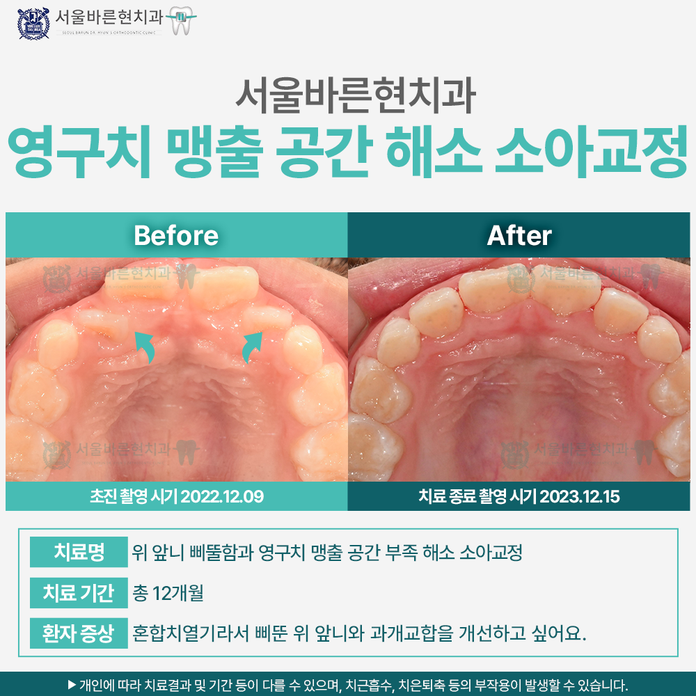 치료명 : 위 앞니 삐뚤함과 영구치 맹출 공간 부족 해소 소아교정