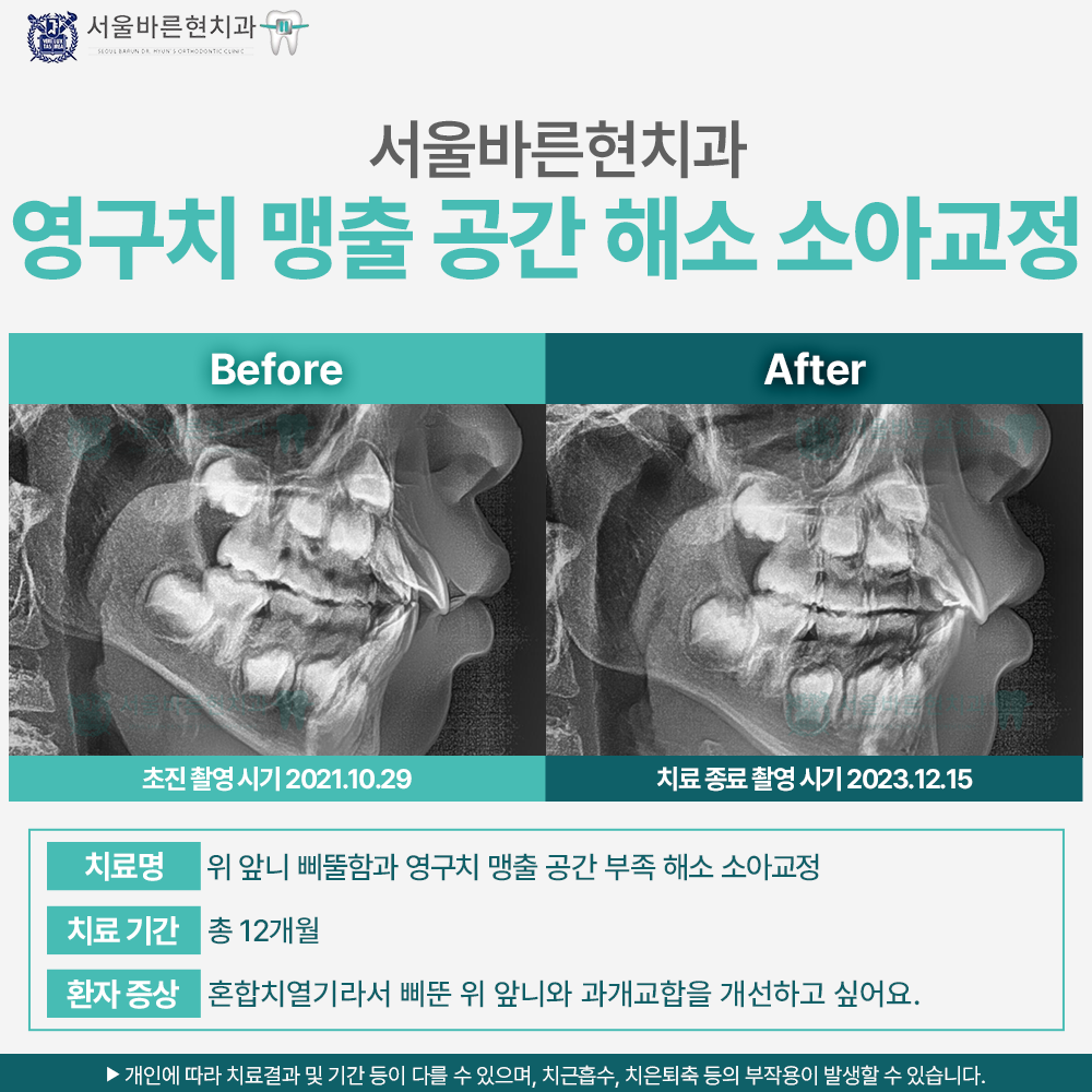 영구치 맹출 공간이 부족하여 위 앞니 배열이 삐뚤 하고 위아래 앞니가 깊게 맞물리는 과개교합을 개선하기 원하는 혼합치열기의 남환이었습니다. 영구치열 맹출을 위한 공간이 다소 부족해 악궁확장 후 위아래 앞니를 가지런히 배열해 주었습니다. 앞니의 돌출감도 있어 입술 다물기 연습도 함께 하였고, 악궁의 확장 후 위앞니도 가지런히 배열할 수 있었습니다. 현재 영구치열기까지 정기적인 검진을 내원하고 있는 중이며, 환아와 보호자 모두 학령기를 가지런한 앞니로 보낼 수 있게 되어 치료에 만족과 신뢰를 보내주고 있습니다.