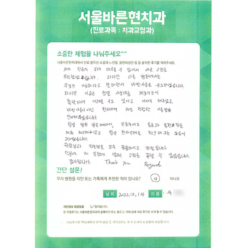 하지만 이곳은 정말 사실대로 치료기간이 촉박하여 어려울 수 있다고 이야기해 주었고 비싼 시술이 아닌 환자에게 제일 적합한 시술법을 안내해 주었습니다. 항상 병원 방문 때마다, 진료 후에도 통증과 불편함을 계속 체크해 주었고 항상 환자 상태를 확인해 주는 모습이 고마웠습니다. 원장님과 직원분들 모두 꼼꼼하시고 친절합니다. 덕분에 제 일정에 맞춰 교정을 끝낼 수 있었습니다. 감사합니다.