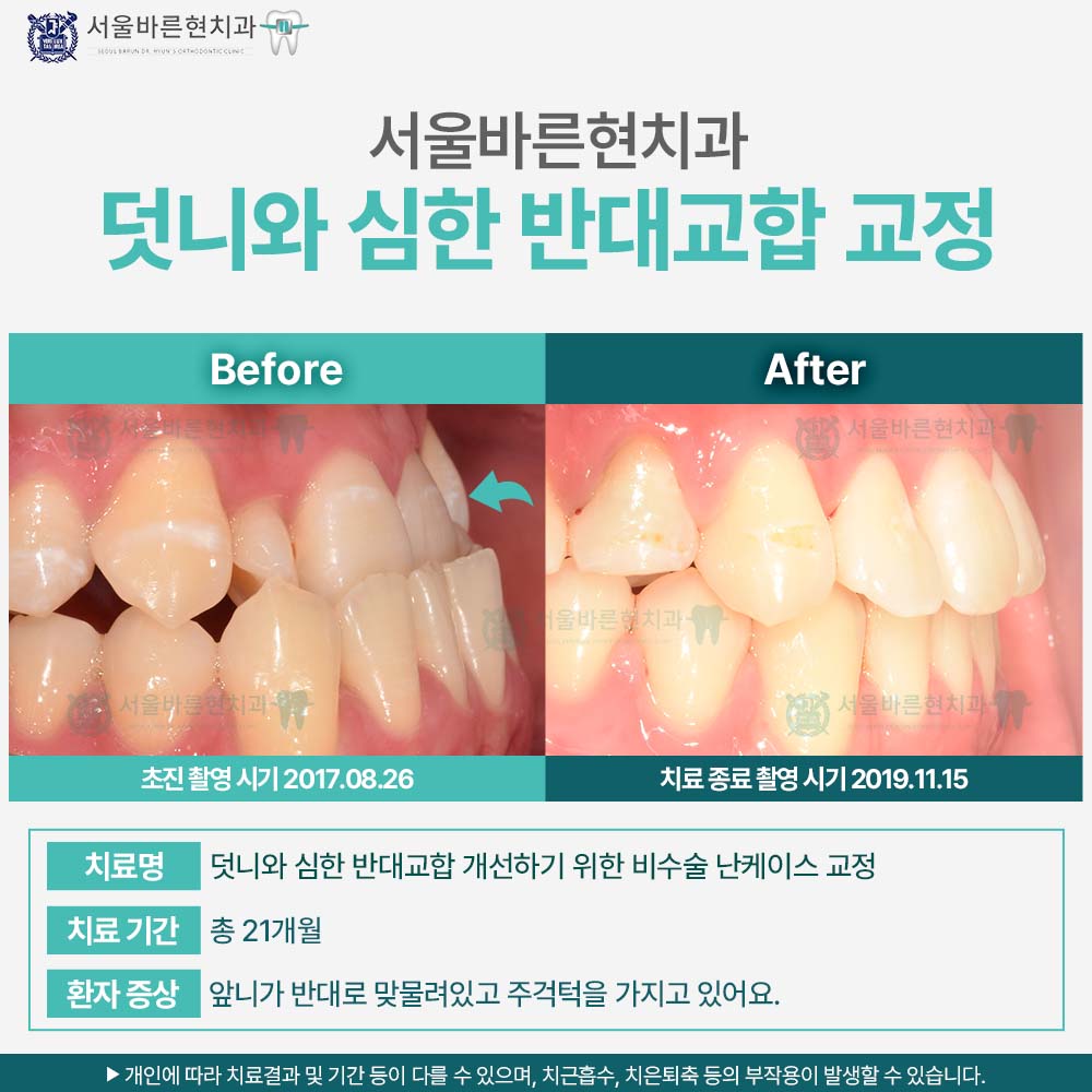 치료명 : 덧니와 심한 반대교합 개선하기 위한 비수술 난케이스 교정