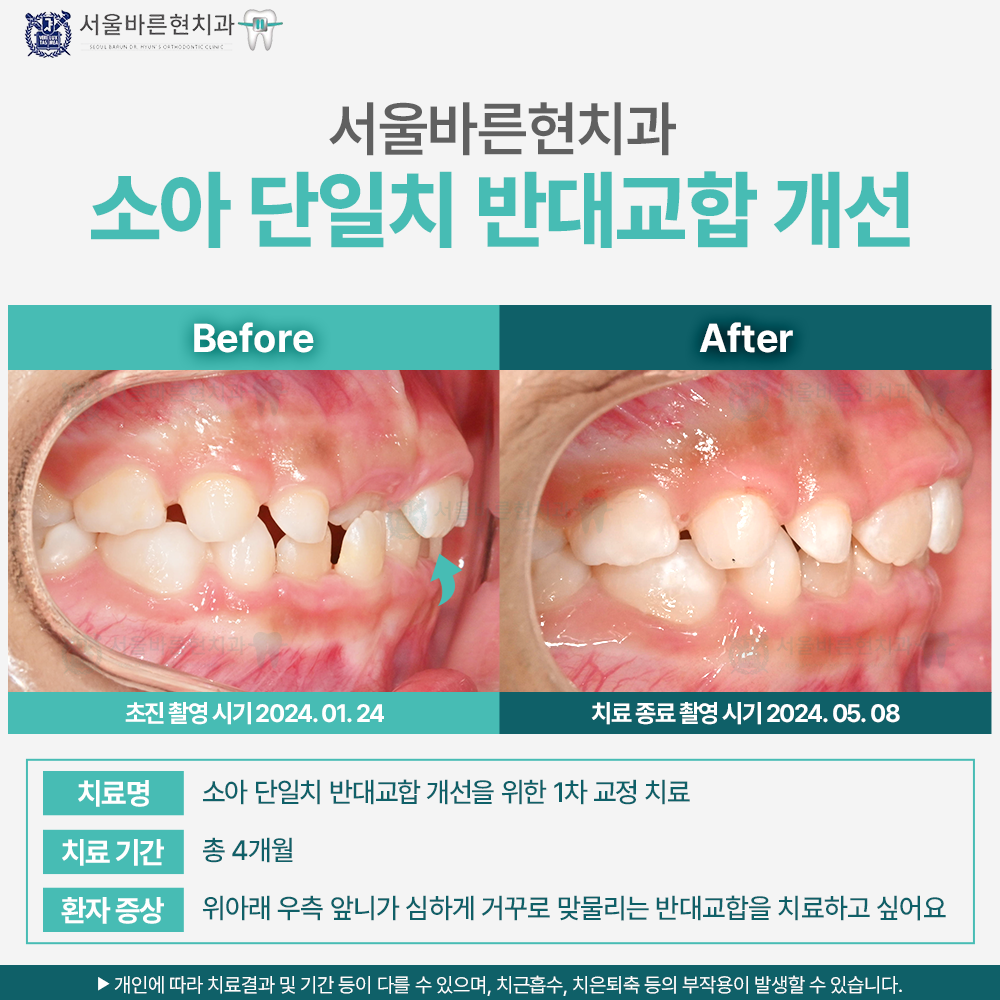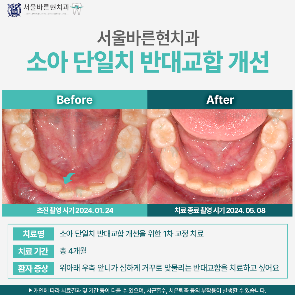 위아래가 우측 앞니가 심하게 거꾸로 맞물리는 반대교합을 지닌 만 7세의 남자 환아였습니다. 앞니의 반대교합은 발견 즉시 개선 해주어야 하는 부정교합입니다. 위아래 앞니의 반대교합을 그대로 둘 경우, 거꾸로 맞물리는 치아의 치은 퇴축 및 치아의 마모가 발생할 수 있고, 주걱턱 안모가 아닌 경우인데도 아래턱을 내밀어 주걱턱의 안모가 될 수도 있습니다. 탈착식 장치보다 부착식 미니 교정기를 이용해 4개월 만에 빠른 개선을 이루었습니다. 현재 환자는 정기 검진 차 내원 중이고 개선 교합은 잘 유지되고 있습니다.