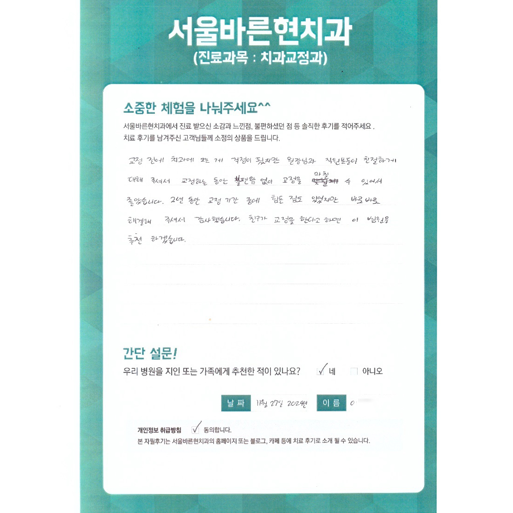친절하게 대해 주셔서 교정하는 동안 불편함 없이 교정을 마칠 수