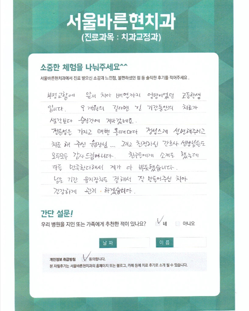 부정교합에 앞니 치아 배열까지 엉망이었던 고등학생입니다.