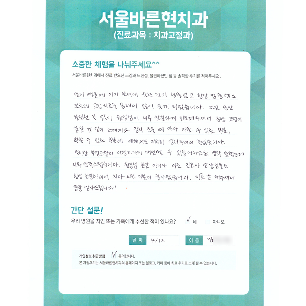 항상 콤플렉스였는데 교정치료를 통해서 많이 웃게 되었습니다.
