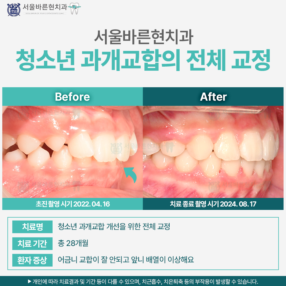 위아래가 깊게 맞물리고 어금니 교합이 잘 안 되며 앞니의 배열 이상이 있는 부분을 개선하고자 하는 청소년 여환이었습니다. 본원에서 치료가 끝난 지인의 추천으로 내원하였고, 과개교합의 개선을 위해 교합판을 사용한 이후 발치 없이 전체적인 교합 개선을 위한 교정치료를 진행하였습니다. 위아래 앞니가 삐뚤하고 과개교합을 지니고 있는 증례라 성장기에 치료해 줄 경우 안정적인 좋은 결과를 얻을 수 있는 증례였습니다. 멀리서 내원하여, 불편감이 없도록 내원 간격을 최대한 길게 조절하였으며 좋은 결과로 치료를 마무리할 수 있었습니다. 현재 과개교합 재발 여부를 지속적으로 모니터링 하며 유지 관리차 정기적으로 내원 중입니다.