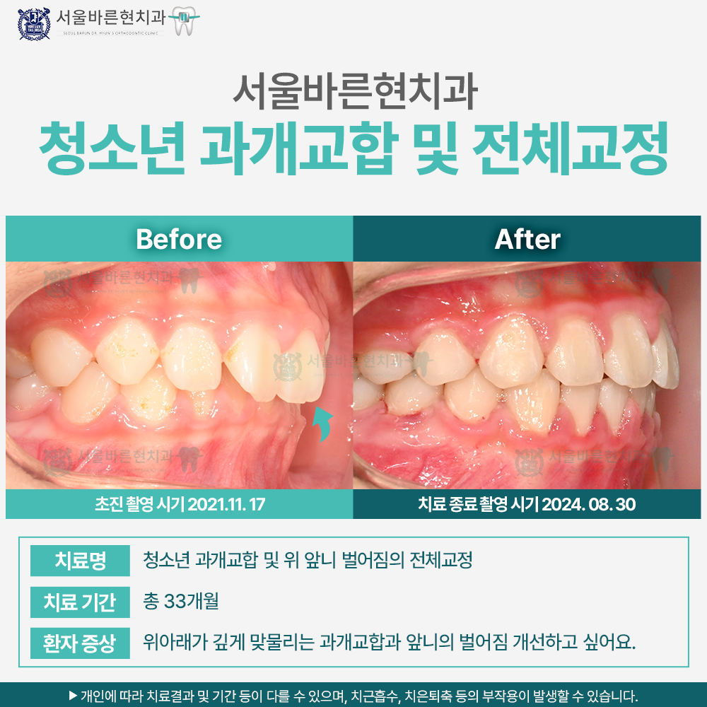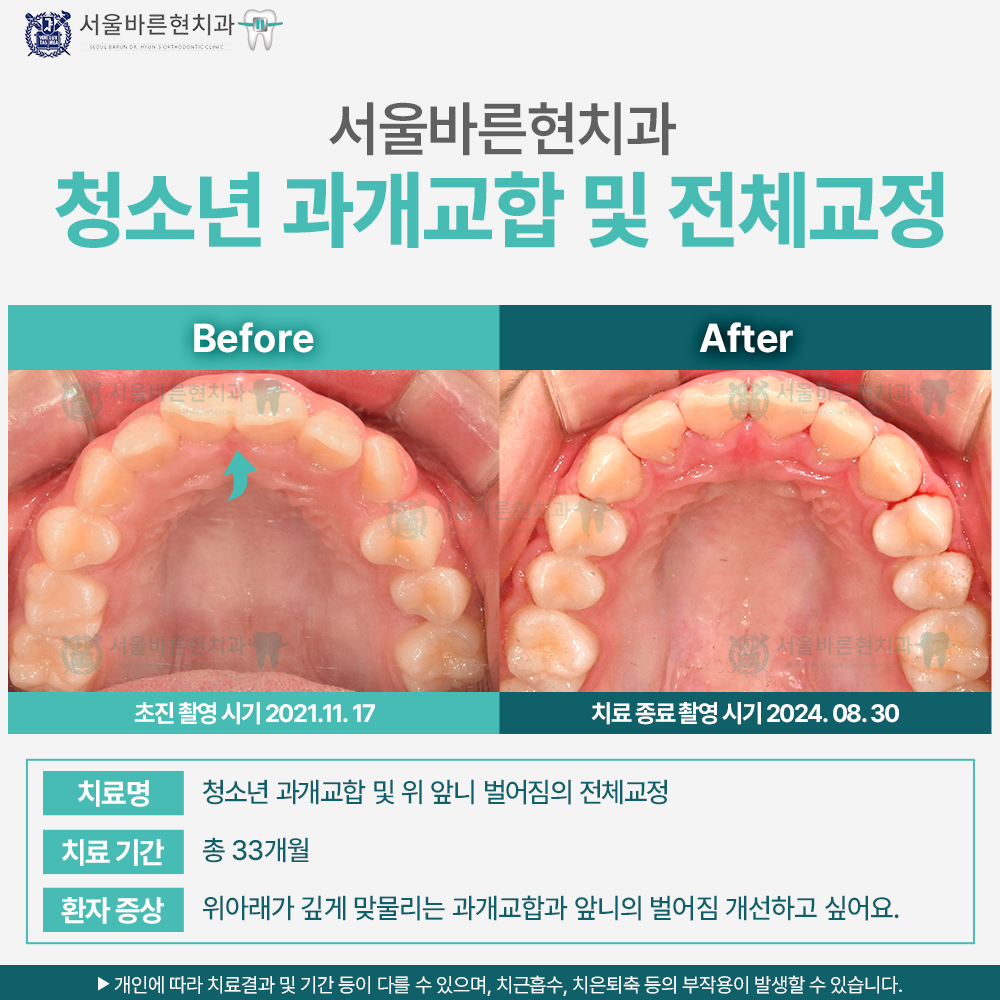 위아래가 깊게 맞물리는 과개교합과 함께 위 앞니가 돌출되어 앞니의 벌어짐이 있는 청소년 여환이었습니다. 비발치로 치료가 가능한 상황이었고 윗치열의 돌출 및 과개교합을 발치없이 아래턱 성장의 이용과 상악치열의 후방이동으로 개선하기로 하였습니다. 협조도가 좋을 경우 안정적인 좋은 결과를 얻을 수 있는 증례였습니다. 성장기에 과개교합을 치료하면 보다 안정적인 결과를 얻을 수 있습니다, 학업에 불편감이 없도록 내원 간격을 길게하고 불편감이 없도록 세심하게 진료하였고 방학 기간 중 해외 일정으로 치료기간이 다소 길어졌지만 위 앞니의 돌출 개선 및 과개교합도 충분히 개선되어 좋은 결과로 치료를 마무리 할 수 있었습니다. 현재 과개교합 재발 여부를 지속적으로 모니터링 하며 유지 관리차 정기적으로 내원 중입니다.