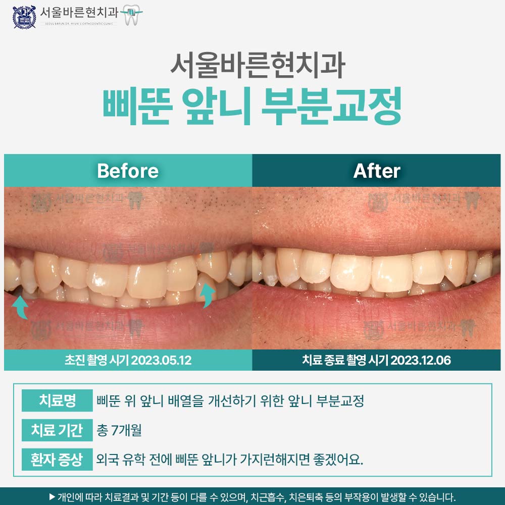 삐뚤한 위 앞니를 가지런하게 하기 위해 내원한 20대 남성 환자분입니다. 외국 유학 예정으로 치료를 6개월 정도에 마치기를 원하셨고 전체적인 교정치료가 필요한 상황이었으나 위 앞니만 빠르게 배열하기를 원하셨습니다. 왼쪽 위 송곳니가 심한 덧니가 앞니 배열로 배열 개선하기에는 부족함이 있었으나 7개월의 시간 동아 최대한 위 앞니 배열을 바로 잡았습니다. 치료 시간의 부족으로 다소 아쉬웠지만 환자분은 치료에 너무 만족하셨고 활짝 웃을 수 있게 되었다며 기뻐하셨습니다.