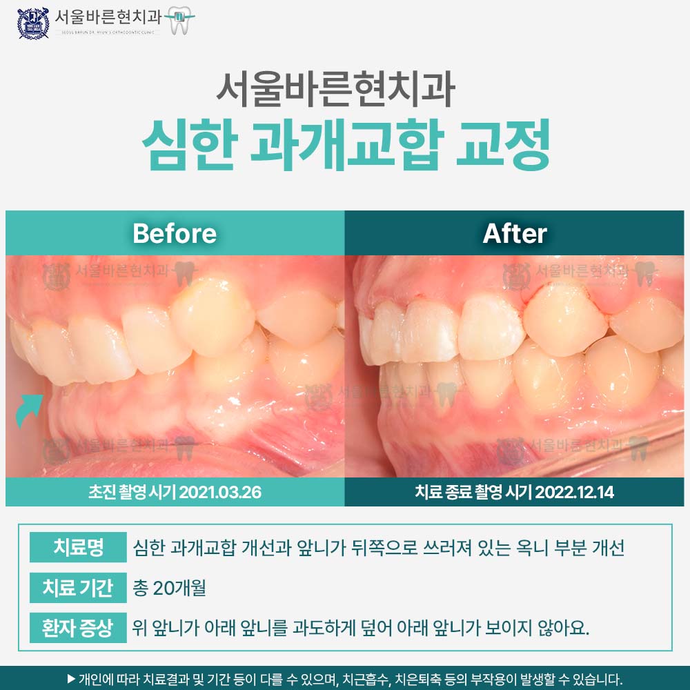 심한 과개교합을 개선하기 위해 내원한 20대 여성 환자분입니다. 위 앞니가 아래 앞니를 과도하게 덮어 아래앞니가 전혀 보이지 않으며 위 앞니가 뒤쪽으로 쓰러져 있는 옥니 부분을 개선 원하셨습니다. 성인에서 과개교합은 개선하기 어렵고 재발 가능성이 높은 부정교합 유형 중 하나입니다. 환자분은 위 앞니 치근까지 짧아 치료를 조심스럽게 진행하였습니다. 어려운 증례였지만 위 앞니의 치아 각도도 정상적으로 회복하고 위 앞니가 아래 앞니를 정상적으로 덮을 수 있도록 교합개선을 하고 치료를 마무리하였습니다. 환자분은 치료 결과에 매우 만족하셨고 웃을 때 보다 자연스러움 입매를 가지게 되었다며 기뻐하셨습니다.