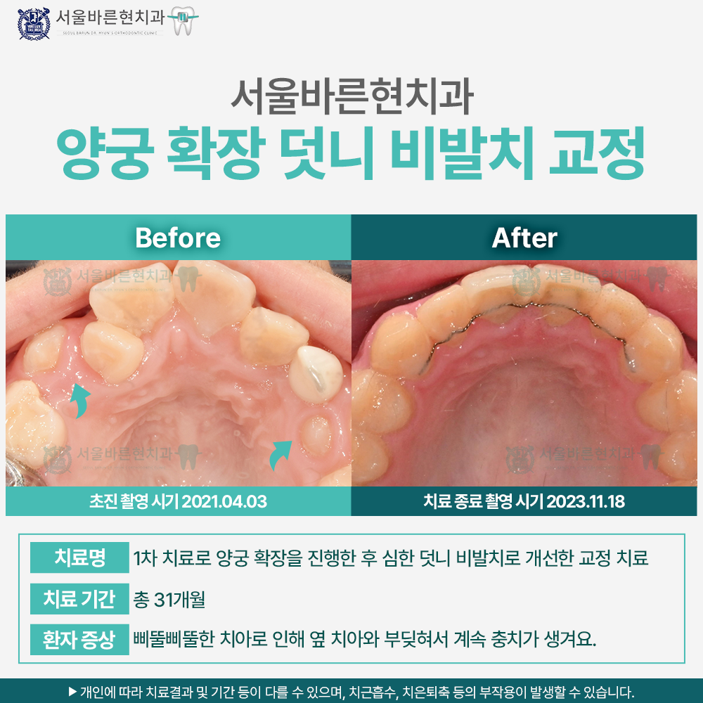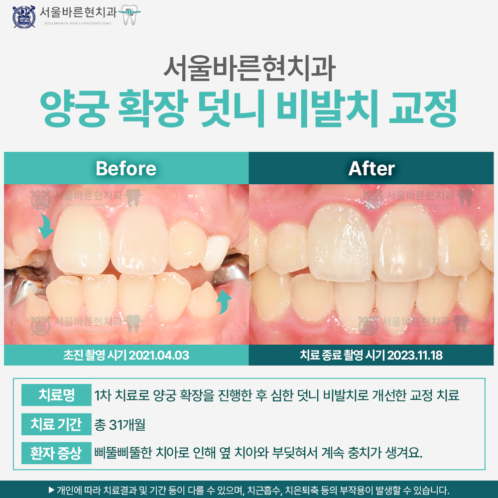치료명 : 1차 치료로 양궁 확장을 진행한 후 심한 덧니 비발치로 개선한 교정 치료