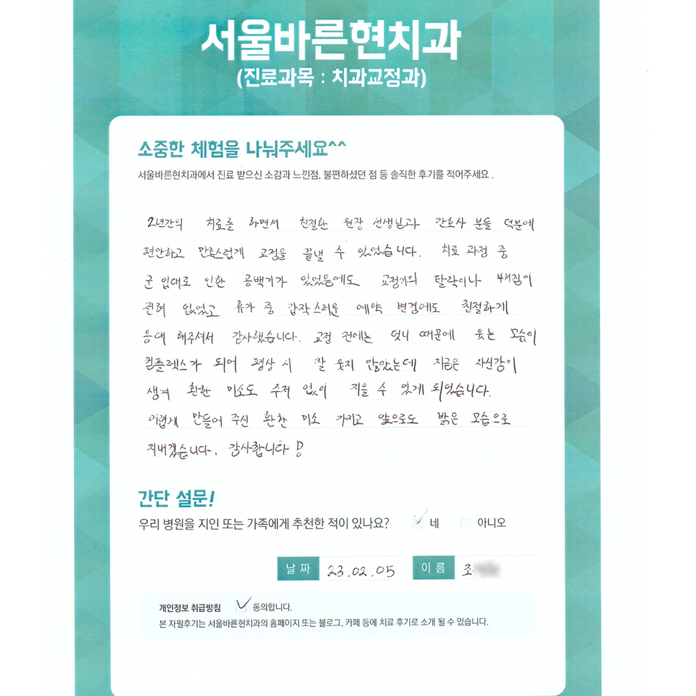 편안하고 만족스럽게 교정을 끝낼 수 있었습니다. 치료 과정 중 군 입대로 인한