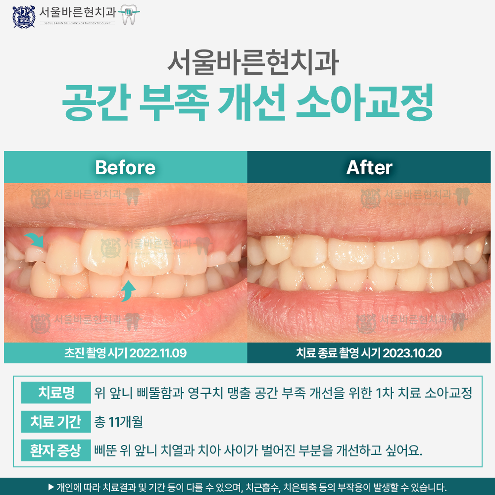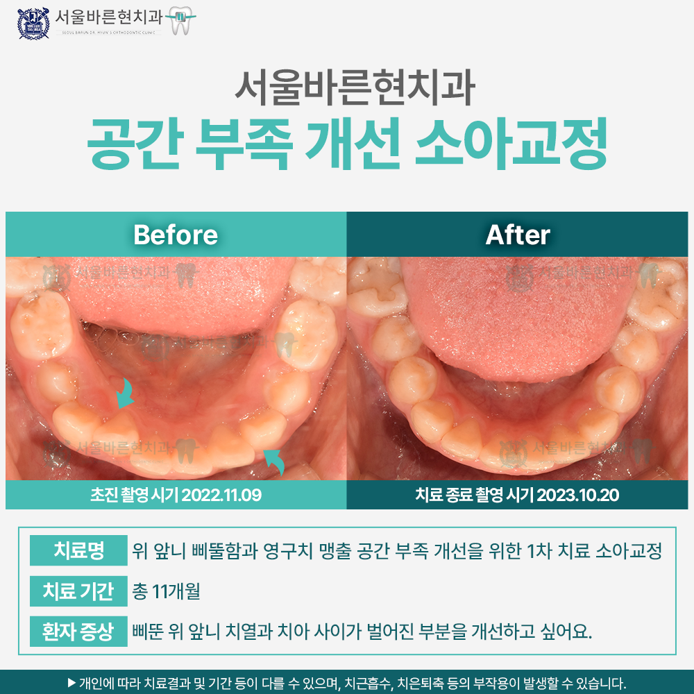위 앞니 배열이 삐뚤하고 치아사이가 벌어진 부분을 바르게 개선하기 위해 내원한 혼합치열기의 초등학교 5학년 여환이었습니다. 영구치열 맹출을 위한 공간이 다소 부족해 악궁확장 후 위아래 앞니를 가지런히 배열해 주었습니다. 환아의 의지로 앞니를 가지런히 하기를 원했기 때문에 치료에 협조도가 매우 좋았고, 치아배열도 빠르게 가지런히 달성할 수 있었습니다. 현재 영구치열기까지 정기적인 검진을 내원하고 있는 중이며, 환아와 보호자 모두 치료에 만족과 신뢰를 보내주고 있습니다.