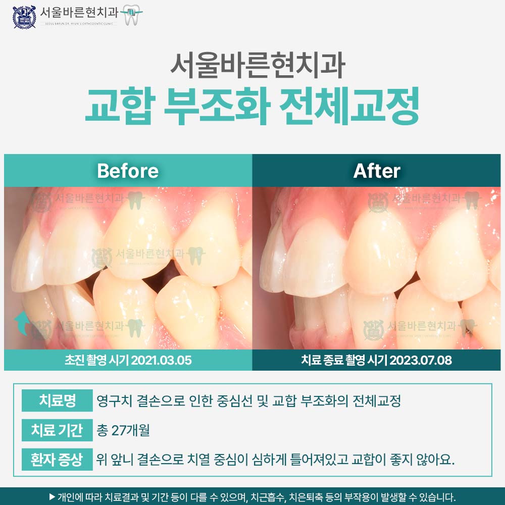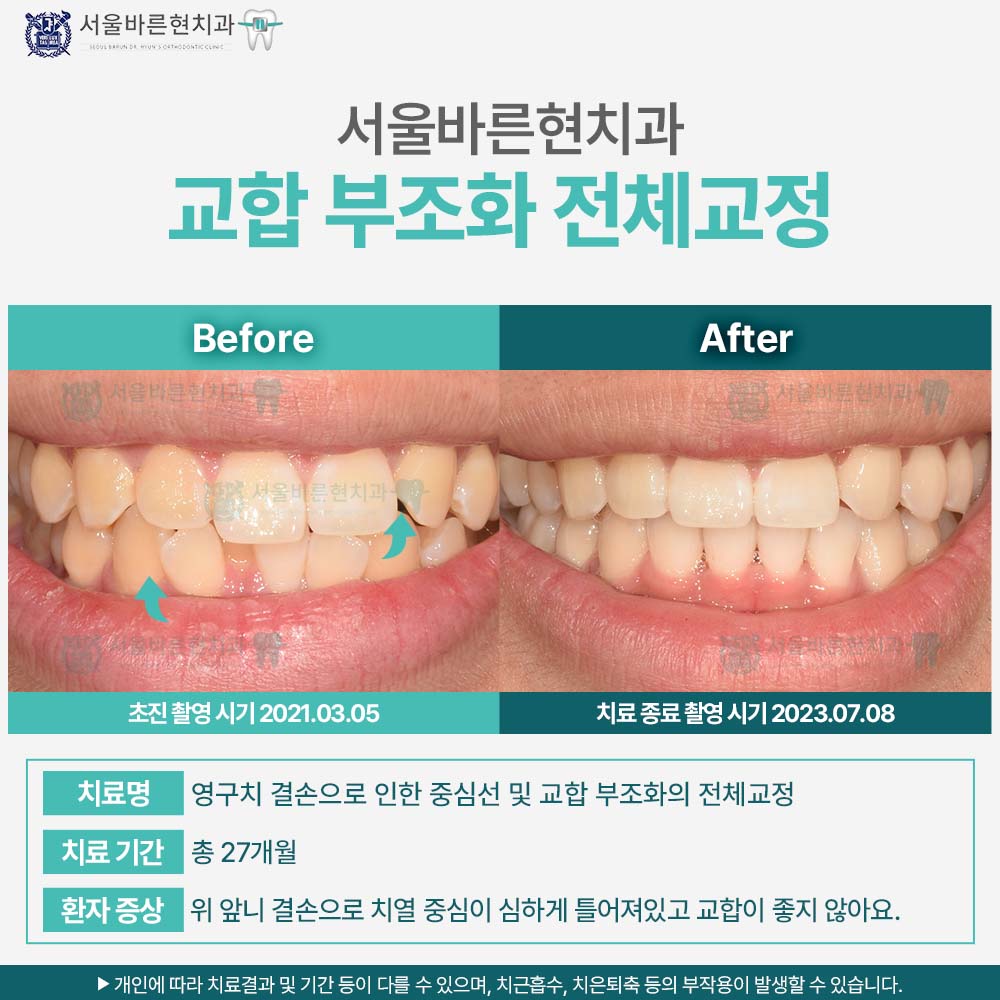 치료명 : 영구치 결손으로 인한 중심선 및 교합 부조화의 전체교정