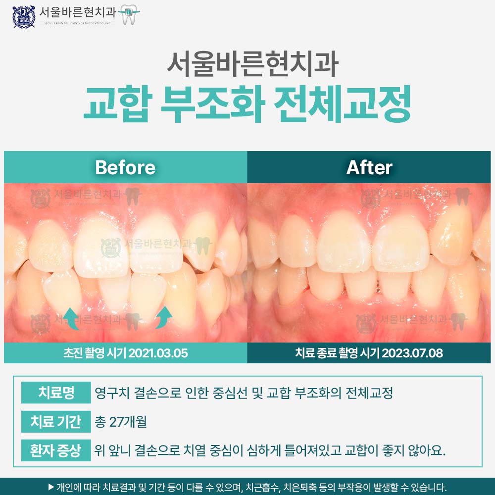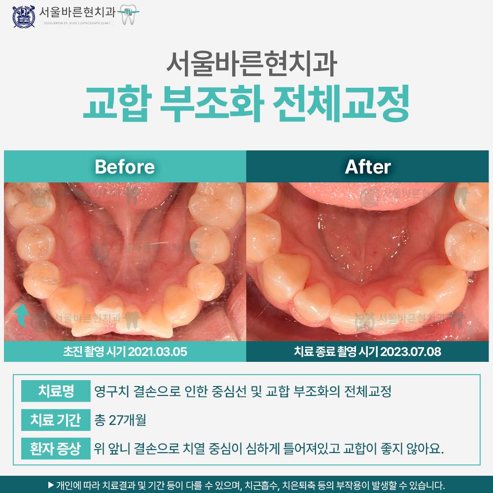 치료명 : 영구치 결손으로 인한 중심선 및 교합 부조화의 전체교정
