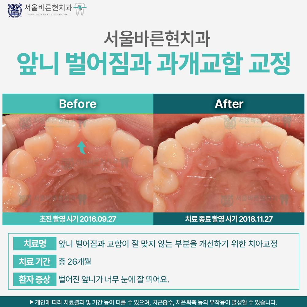 위아래 앞니가 벌어진 부분과 교합이 잘 맞지 않는 부분을 개선하고자 내원한 10대 여학생입니다. 환아 보호자는 위아래 앞니 사이의 공간이 점점 벌어지며 돌출감이 심해지는 것 같다 하셨습니다. 치아 사이 공간이 심해지는 부분에는 혀를 앞으로 내미는 습관도 영향을 주고 있는 상황이라, 혀 내밀기 습관 개선을 하면서 전체치료를 진행하였습니다. 현재 주기적으로 정기 체크를 내원하고 있으며 치아사이 공간은 큰 재발 없이 치료결과를 잘 유지하고 있습니다.