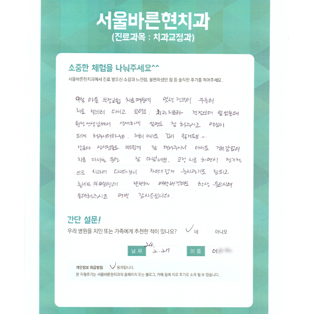 아이도 거부감 없이 치료 다니는 동안 잘 다녔네요. 교정 치료 하면서 정기적으로