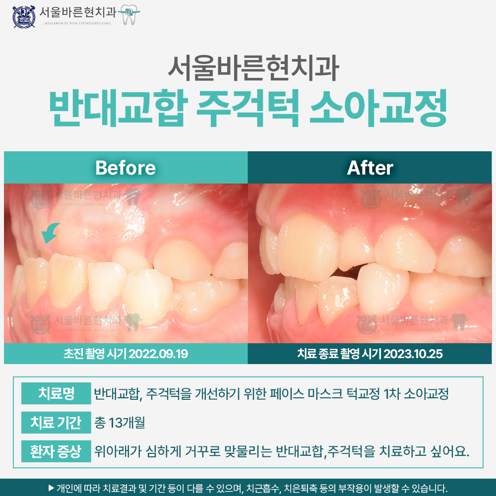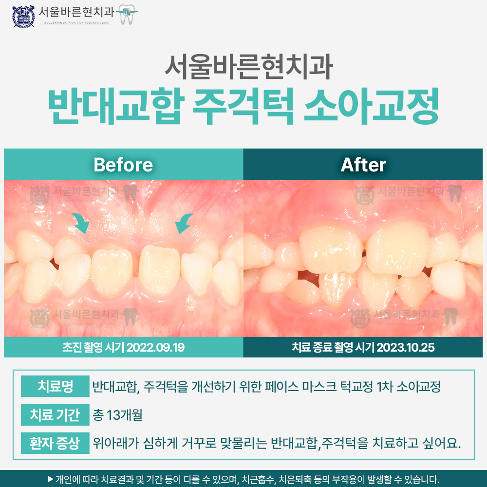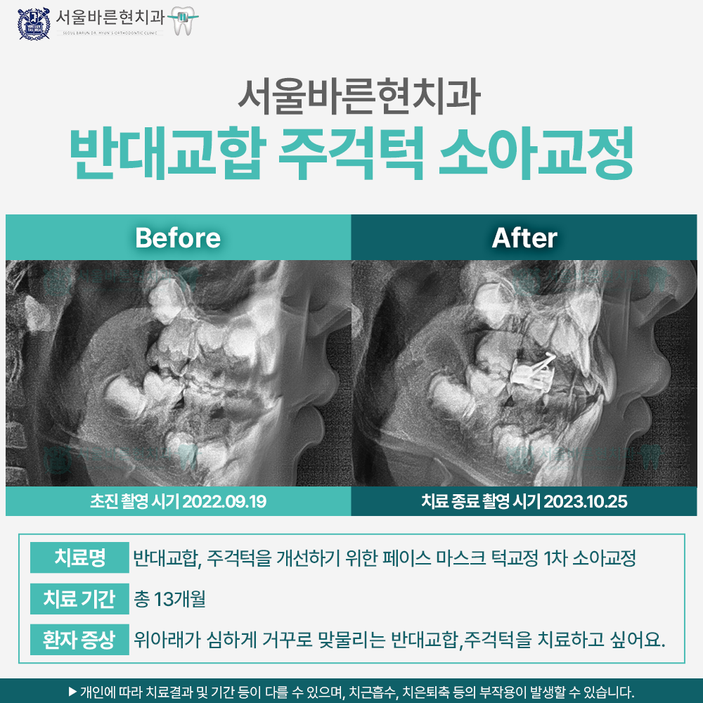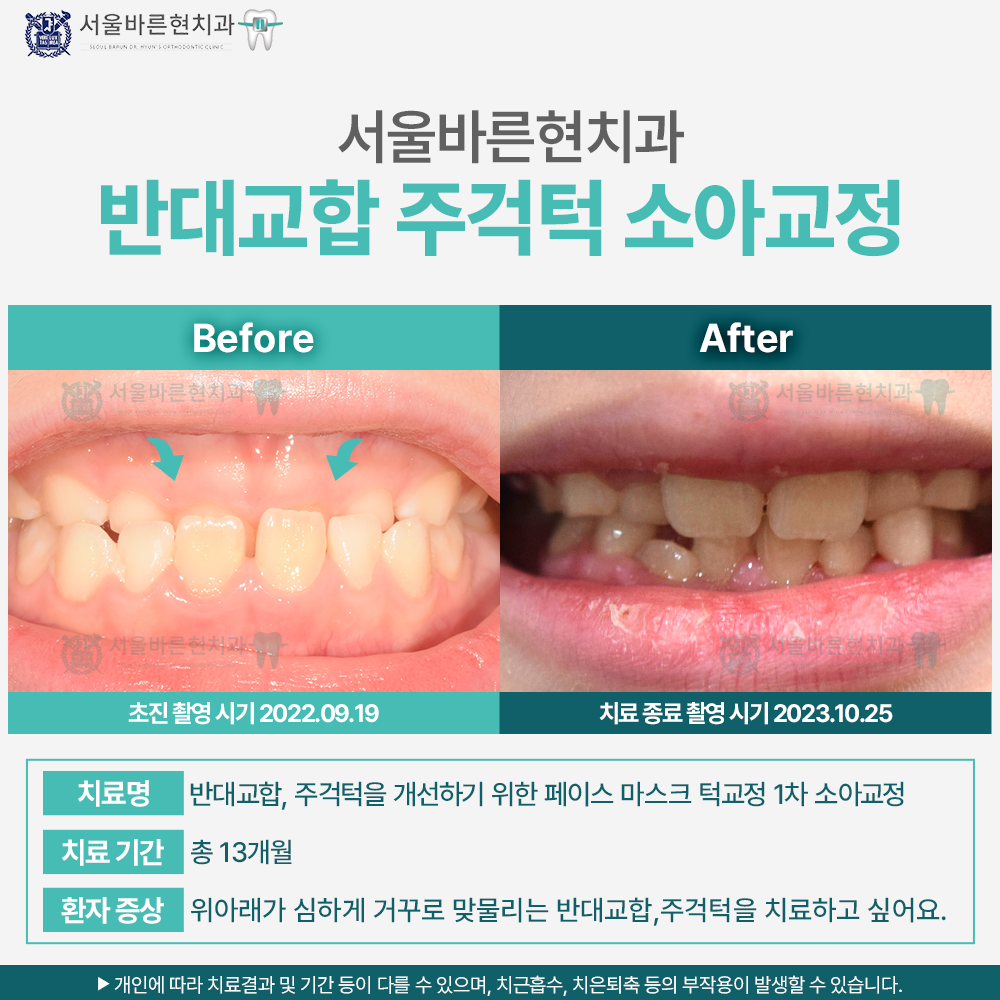위아래가 심하게 거꾸로 맞물리는 반대교합의 주걱턱 골격관계를 지닌 만 7세의 남자 환아였습니다. 유치열기였지만 반대교합 정도가 심해 페이스마스크 치료를 바로 진행하여 주걱턱관계와 반대교합을 개선해 주기로 하였습니다. 앞니의 반대교합은 발견 즉시 개선 해주어야 하는 부정교합이며, 주걱턱 개선을 위한 페이스 마스크는 가능하면 최대한 빠른 시기에 치료해 주는 것이 좋습니다. 최대한 초등학교 저학년 이전에 치료 해야 효과적인 치료이나 잘못된 정보들로 인해 치료 시기를 놓치는 경우가 많습니다. 13개월의 치료로 반대교합과 아래턱이 나온 주걱턱의 외모를 드라마틱하게 개선할 수 있었습니다. 현재 정기적인 검진으로 골격관계와 교합관계가 잘 유지되는지 정기 검진 중에 있습니다. 성장이 정상적으로 진행되면 추후 영구치열 교환 후 전체치료가 필요합니다.