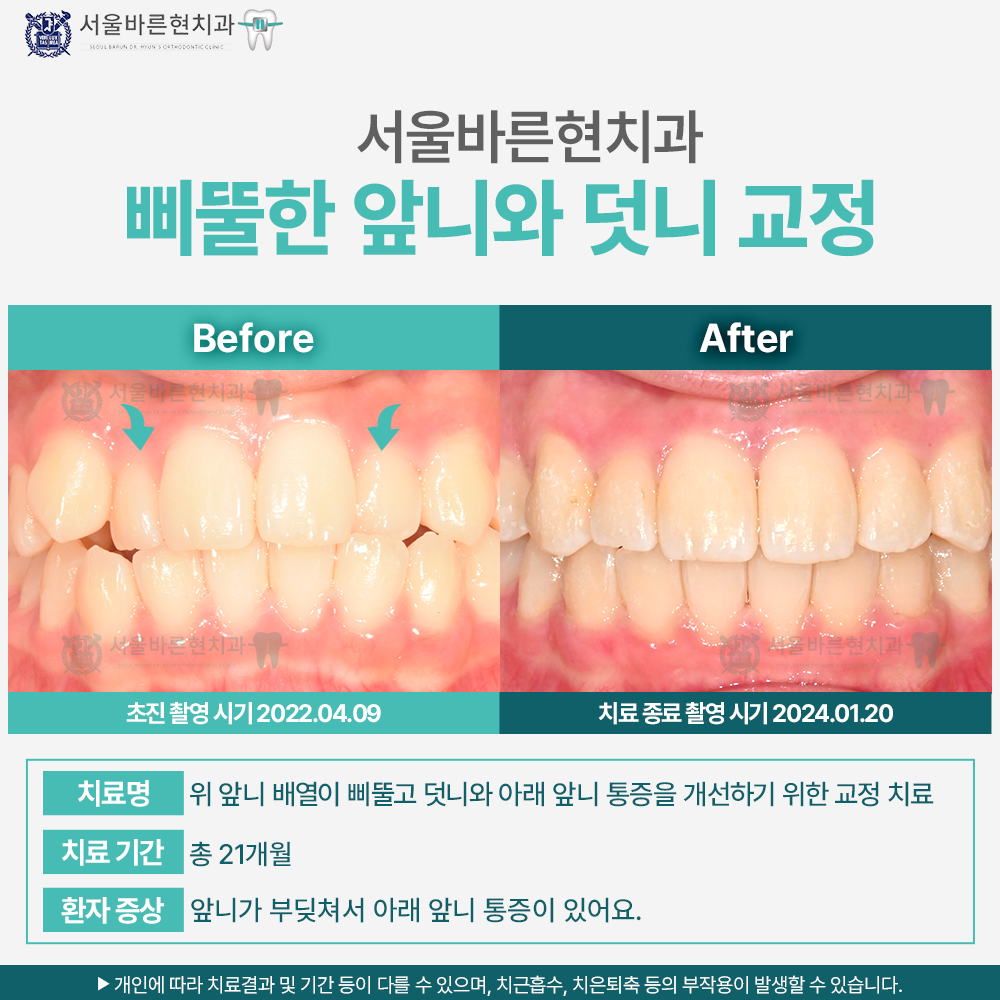 치료명 : 위 앞니 배열이 삐뚤고 덧니와 아래 앞니 통증을 개선하기 위한 교정 치료