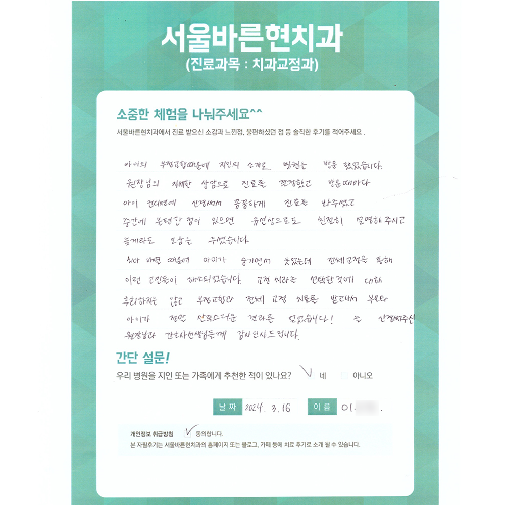 아이의 부정교합때문에 지인의 소개로 병원을 방문했습니다.