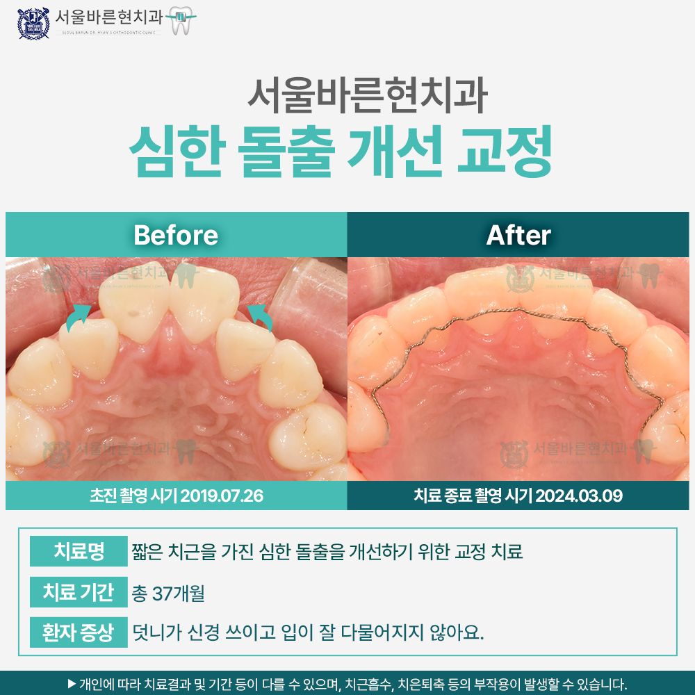 고등학생 여환으로 본원에 지인 소개로 내원하였습니다. 덧니가 신경 쓰이고 입이 잘 다물어지지 않는 부분을 개선하고자 교정치료를 원하였습니다. 위 앞니의 돌출도가 매우 심해 발치가 필요했고 위 앞니 뿌리가 매우 짧아 조심스럽게 위 앞니 돌출을 개선한 증례입니다. 동생도 본원에서 치아 교정을 진행했으며, 현재 성인이 된 환자는 유지관리도 정기적으로 잘 내원하고 있습니다. 다행히 추가적인 치근 흡수 없이 치료 결과는 잘 유지되고 있습니다.