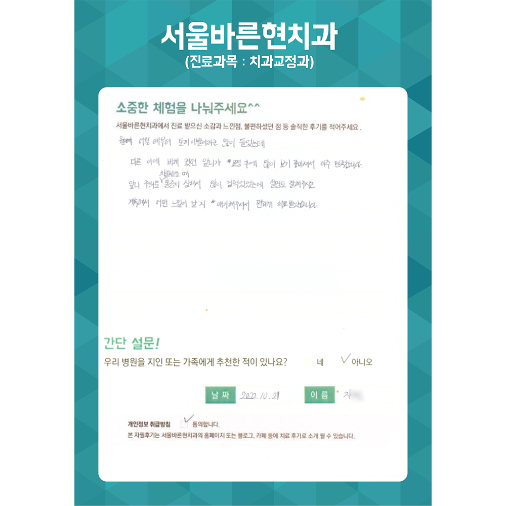 해운대돌출입교정 서울바른현치과는 서울대학교 치의학 박사 수료과정을 마친 대표 원장님이