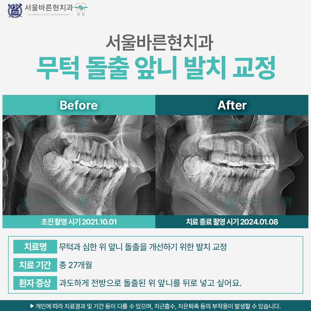 과도하게 전방으로 돌출된 위 앞니를 뒤로 넣기 위해 내원한 만 16세 여환이었습니다. 교합시 위 앞니가 아래 앞니와 맞물리지 않을 정도로 전방으로 돌출되어있었고, 원인은 위턱보다 아래턱이 후방으로 들어가 있는 무턱 때문이었습니다. 아래턱 성장을 도와줄 수 있는 시기는 이미 지났기 때문에 위 작은 어금니를 발거하고 위 앞니를 뒤로 넣어 치아 이동으로 교합을 개선하기로 하였습니다. 치료 종료에 매우 좋은 교합을 달성하였고 환아와 보호자는 본원의 치료 과정과 결과에 매우 만족하였습니다. 어려운 증례지만 활짝 웃는 모습으로 치료를 잘 마무리 하였습니다.