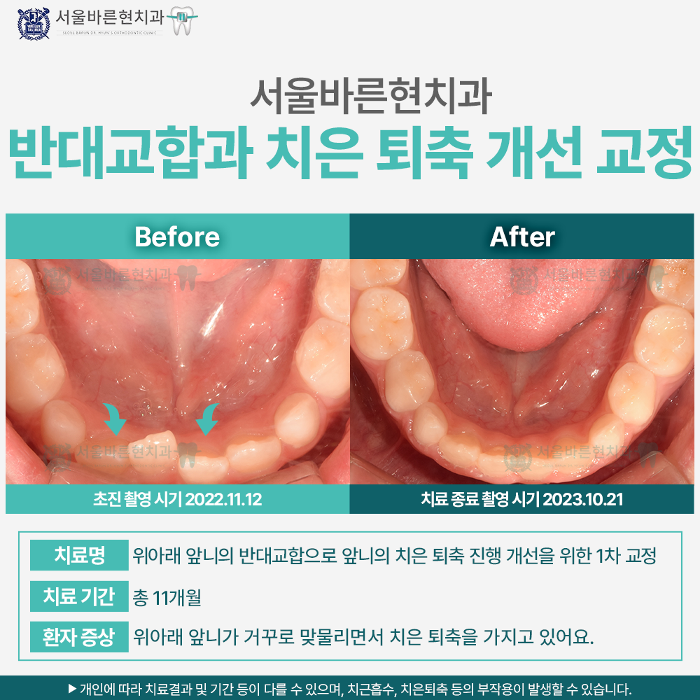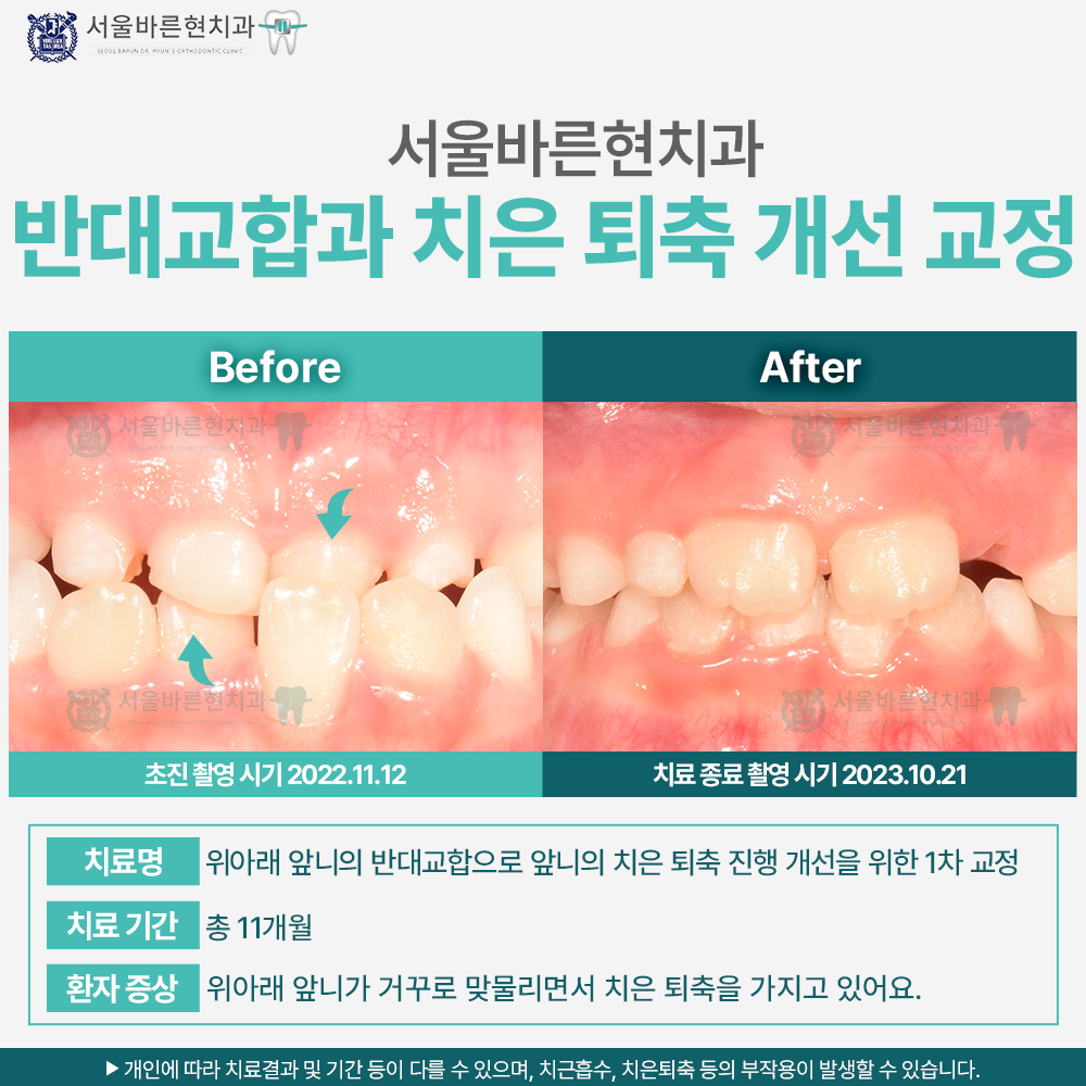 치료명 : 위아래 앞니의 반대교합으로 앞니의 치은 퇴축 진행 개선을 위한 1차 교정
