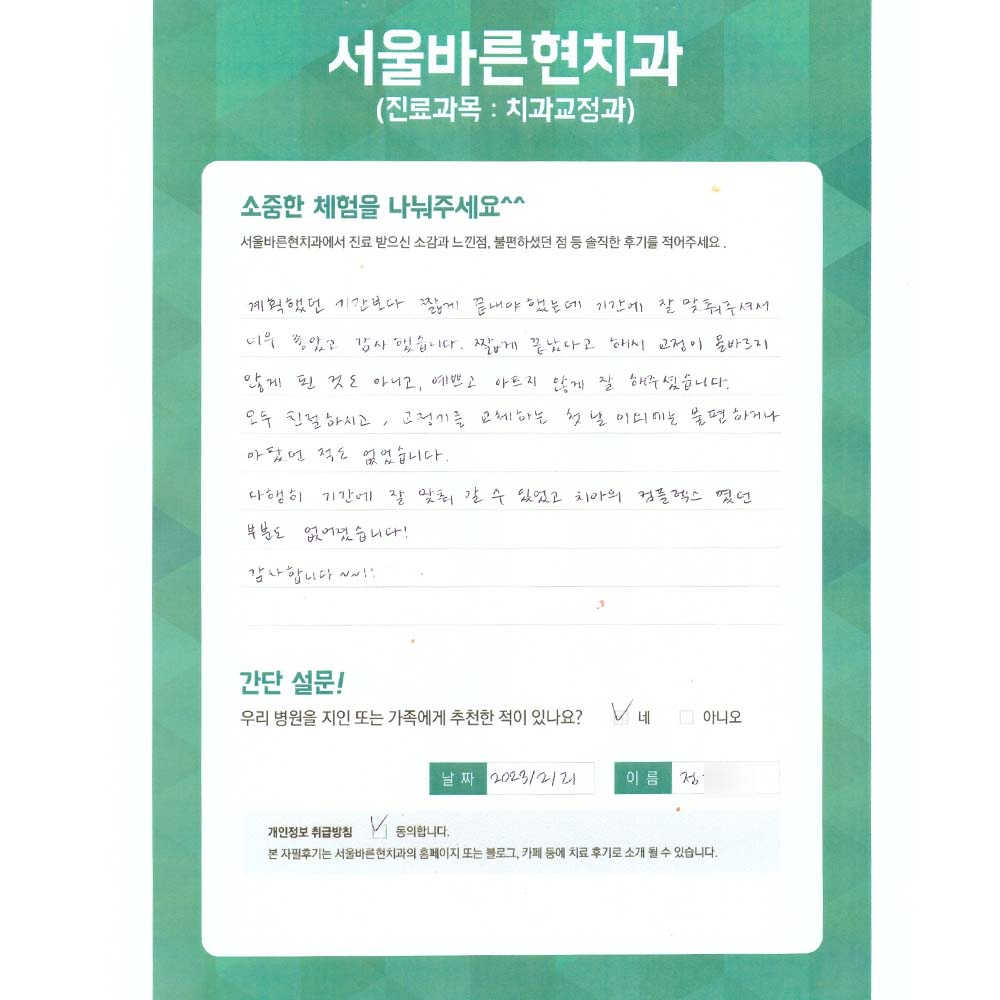 다행히 기간에 잘 맞춰 갈 수 있었고 치아의 콤플렉스였던 부분도 없어졌습니다! 감사합니다.