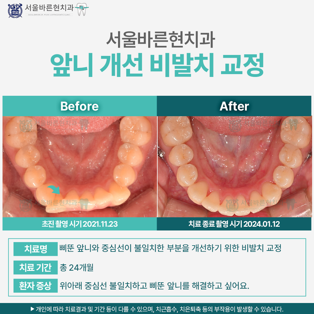 치료명 : 삐뚠 앞니와 중심선이 불일치한 부분을 개선하기 위한 비발치 교정