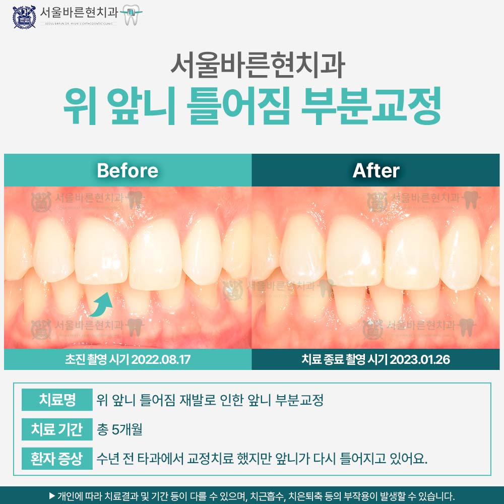 치료명 : 위 앞니 틀어짐 재발로 인한 앞니 부분교정