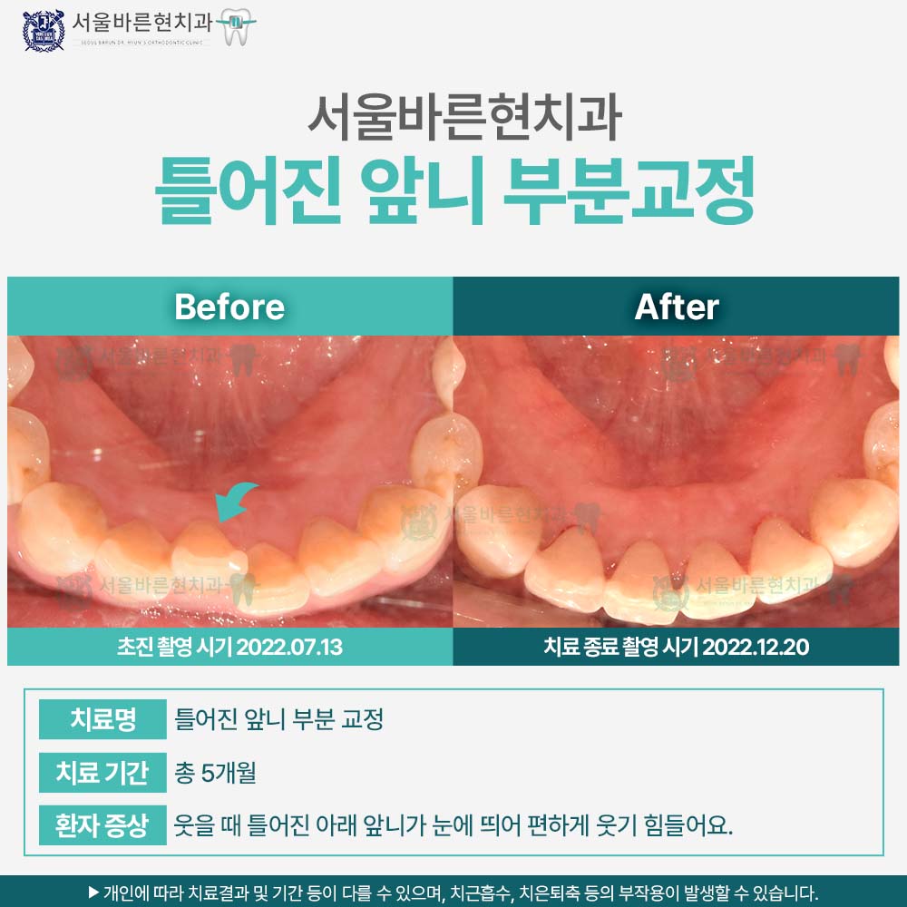 환자증상 : 웃을 때 틀어진 아래 앞니가 눈에 띄어 편하게 웃기 힘들어요.