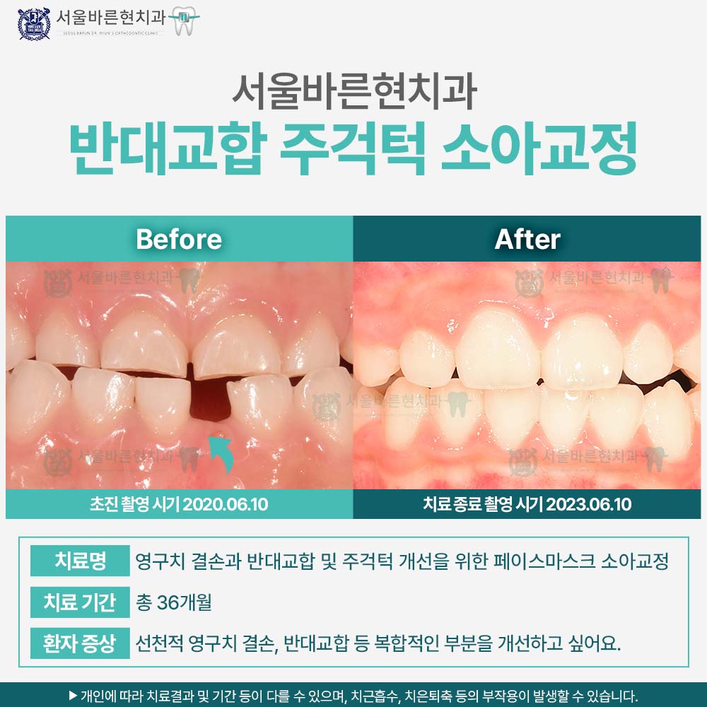 페이스마스크를 꾸준히 착용하면 상악의 성장 방향을 앞쪽으로 유도하여, 반대교합을 정상 교합으로 교정할 수 있습니다. 또한 얼굴의 균형을 개선하고, 외모에 대한 심리적 만족도도 높일 수 있습니다. 무엇보다 조기에 치료를 시작하면 성인이 되어 악교정 수술이 필요한 상황을 예방할 가능성이 커집니다.