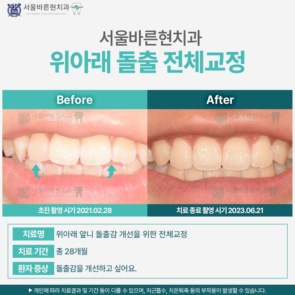 위아래가 함께 돌출된 경우, 단순히 앞니만 밀어넣는 방식으로는 원하는 만큼의 변화가 어렵기 때문에 전체교정이 필요합니다. 특히 턱뼈 구조와 치아 배열을 전반적으로 고려해야 하므로 전문적인 진단과 정밀한 계획이 중요한 케이스입니다.