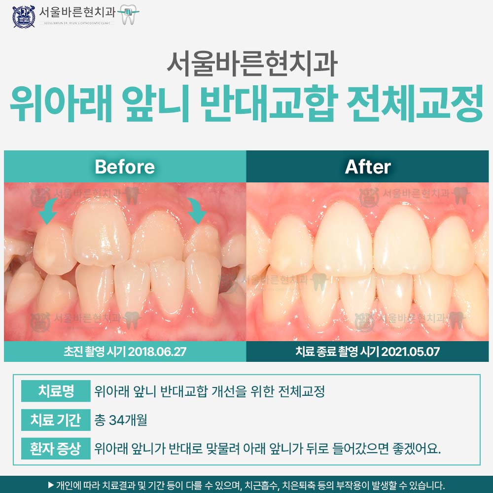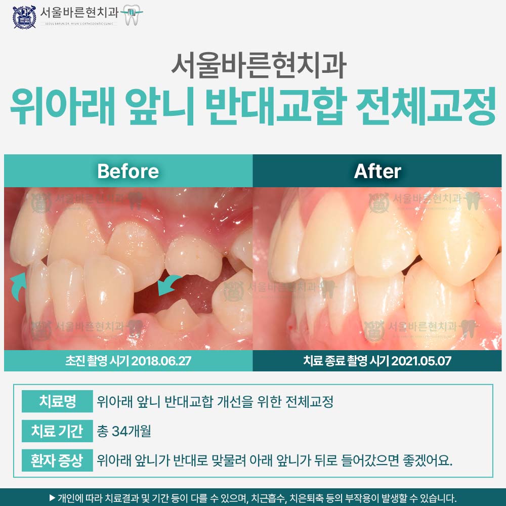 치료명 : 위아래 앞니 반대교합 개선을 위한 전체교정