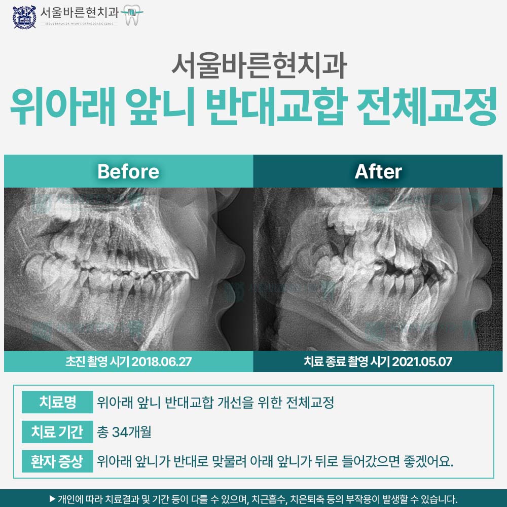 치료명 : 위아래 앞니 반대교합 개선을 위한 전체교정